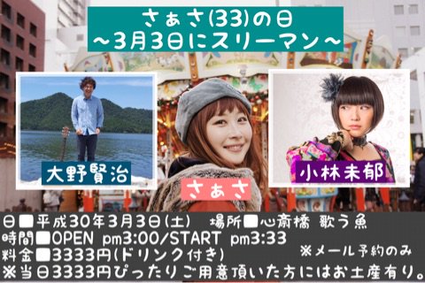 いよいよー!近づいてまいりました!33歳の さぁさ(3ぁ3)の3月3日は一生にこの日しかないということで開催します、さぁさの日イベント!場所は、心斎橋の歌う魚…